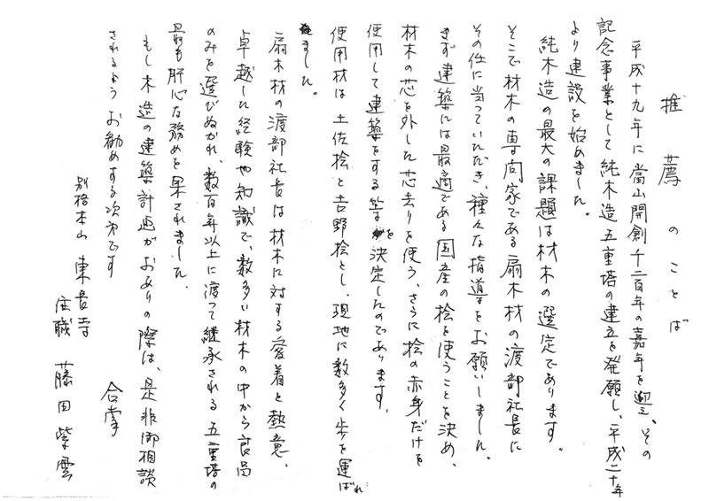 木材選定のご相談を受け無事建立し感謝とご推薦のお言葉をいただきました。